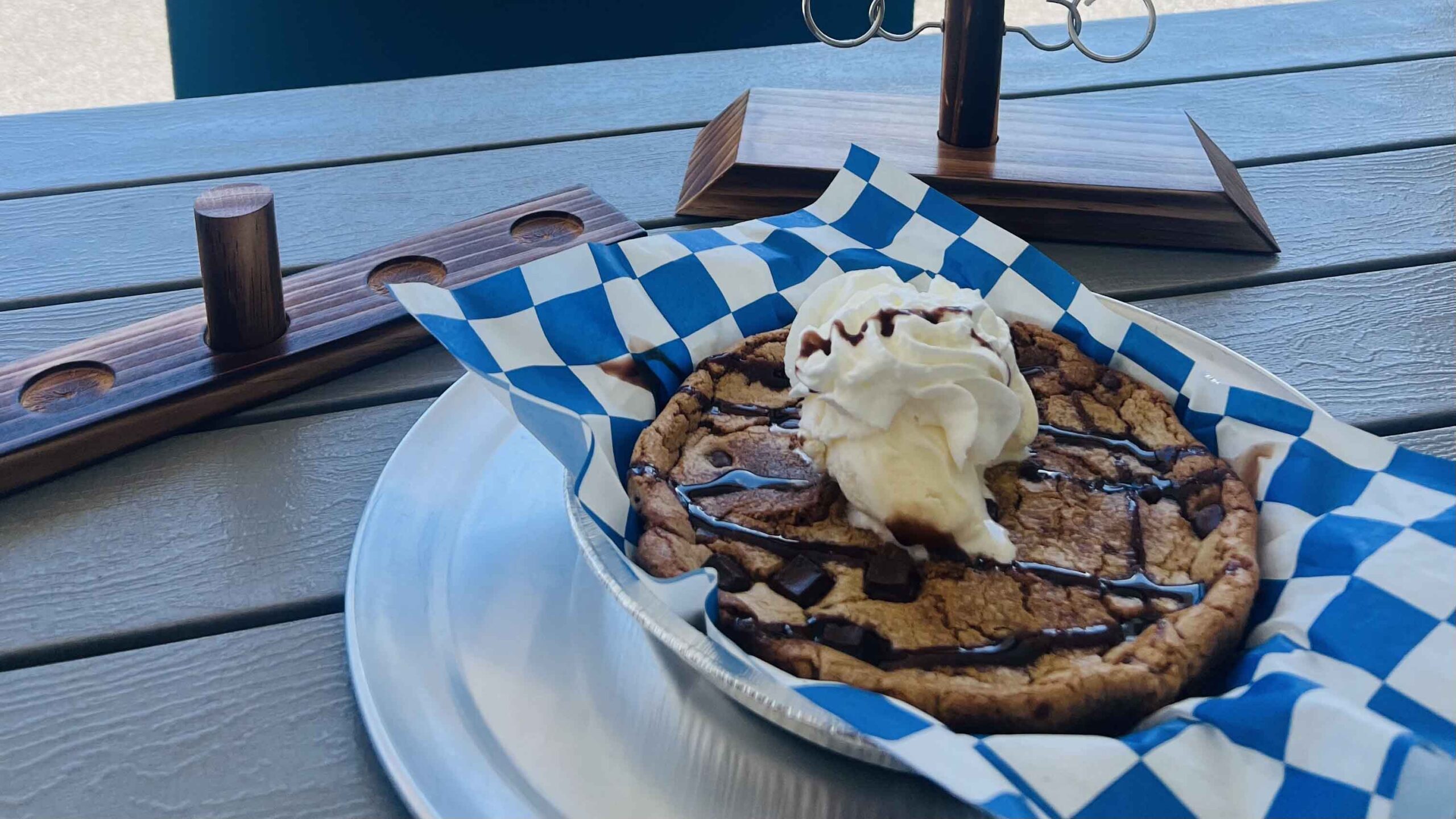 Warm chocolate chip cookie with ice cream, whipped topping, and chocolate drizzle. (Large enough to share)