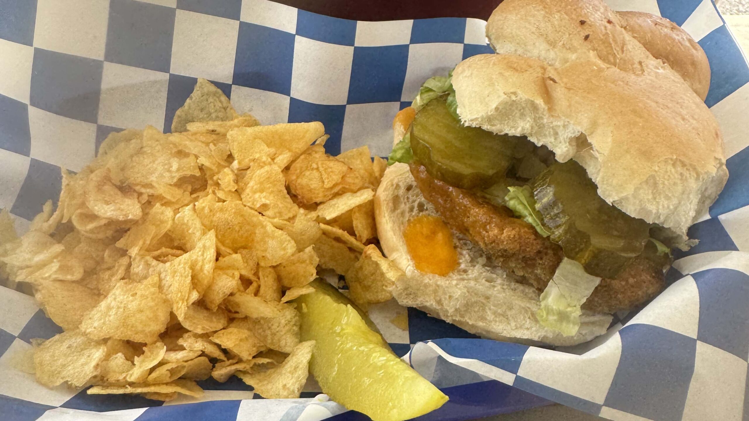 Crispy breaded chicken breast with hot honey drizzle, cheddar cheese, lettuce, and sweet-and-hot pickle chips.